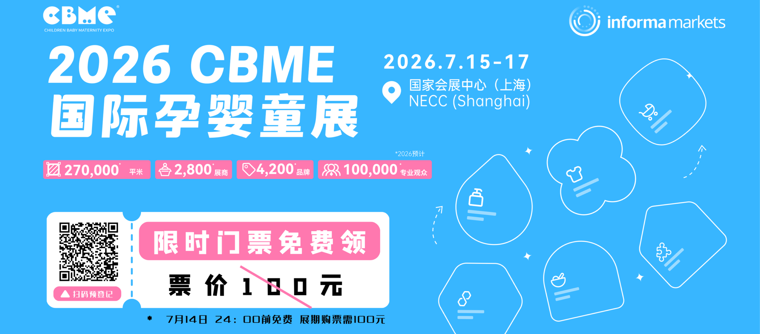 2026 CBME国际孕婴童展,将于2026年7月15-17日在上海国家会展中心(NECC)举行,同期还将举办CBME玩具及教育展、CBME童装展、CBME营养健康食品展 、CBME供应链展、全球授权展·上海站(LEC)。 展示范围覆盖孕婴童用品、