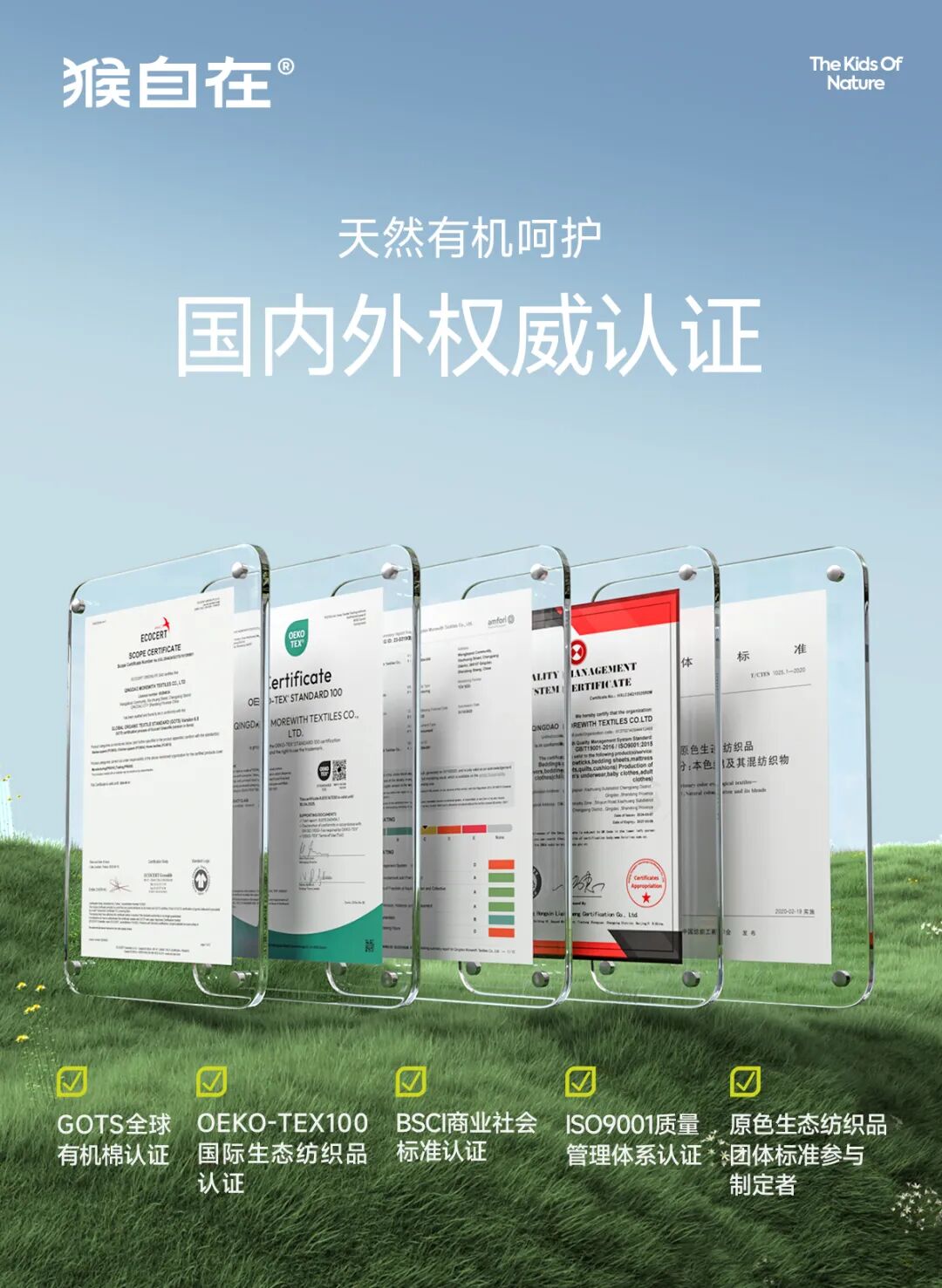 也正是依托这套成熟体系,猴自在从源头就确立了严格的品质标准:采用国际生态纺织品婴儿级标准,严选符合国际认证的有机棉材质。