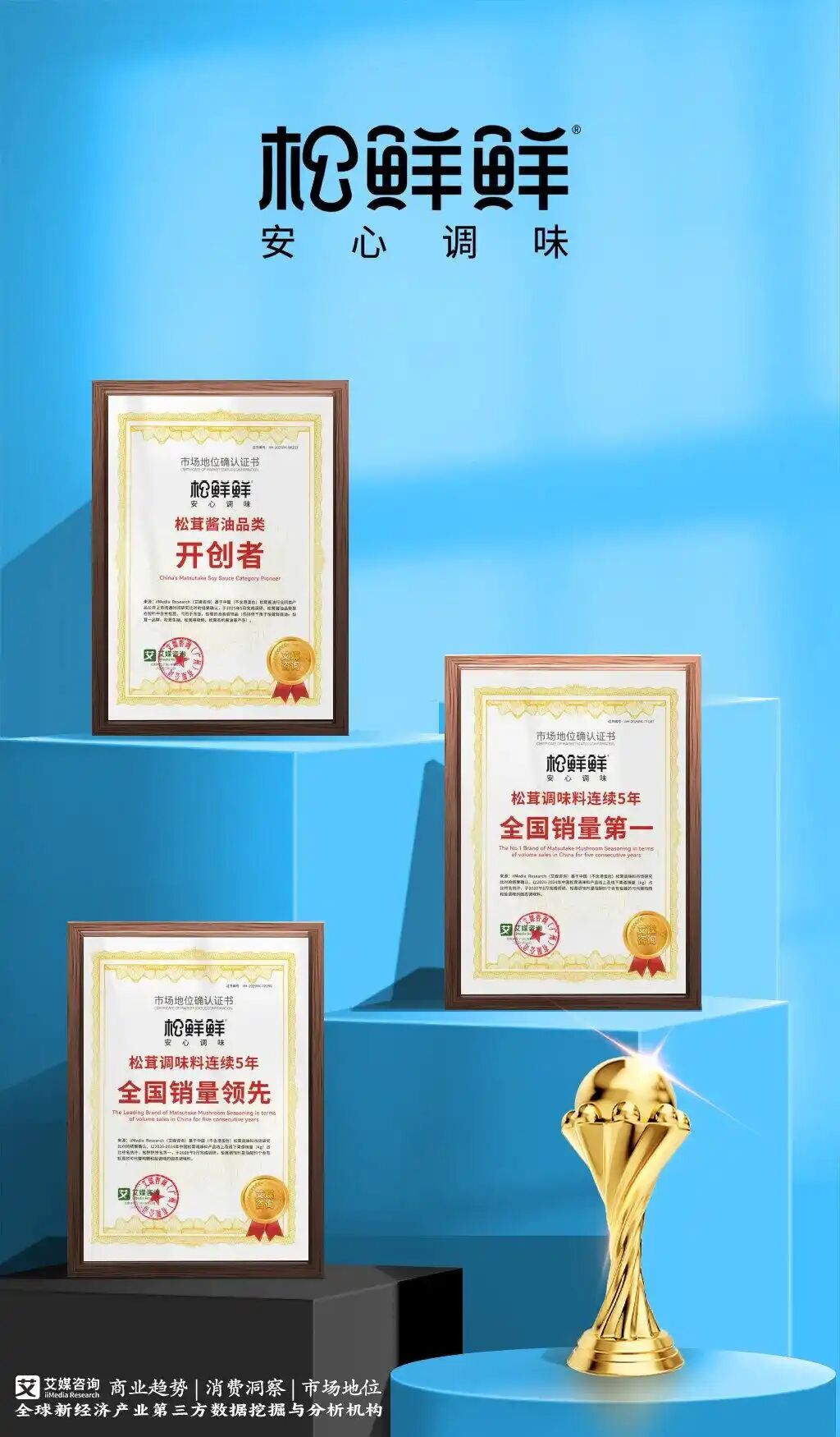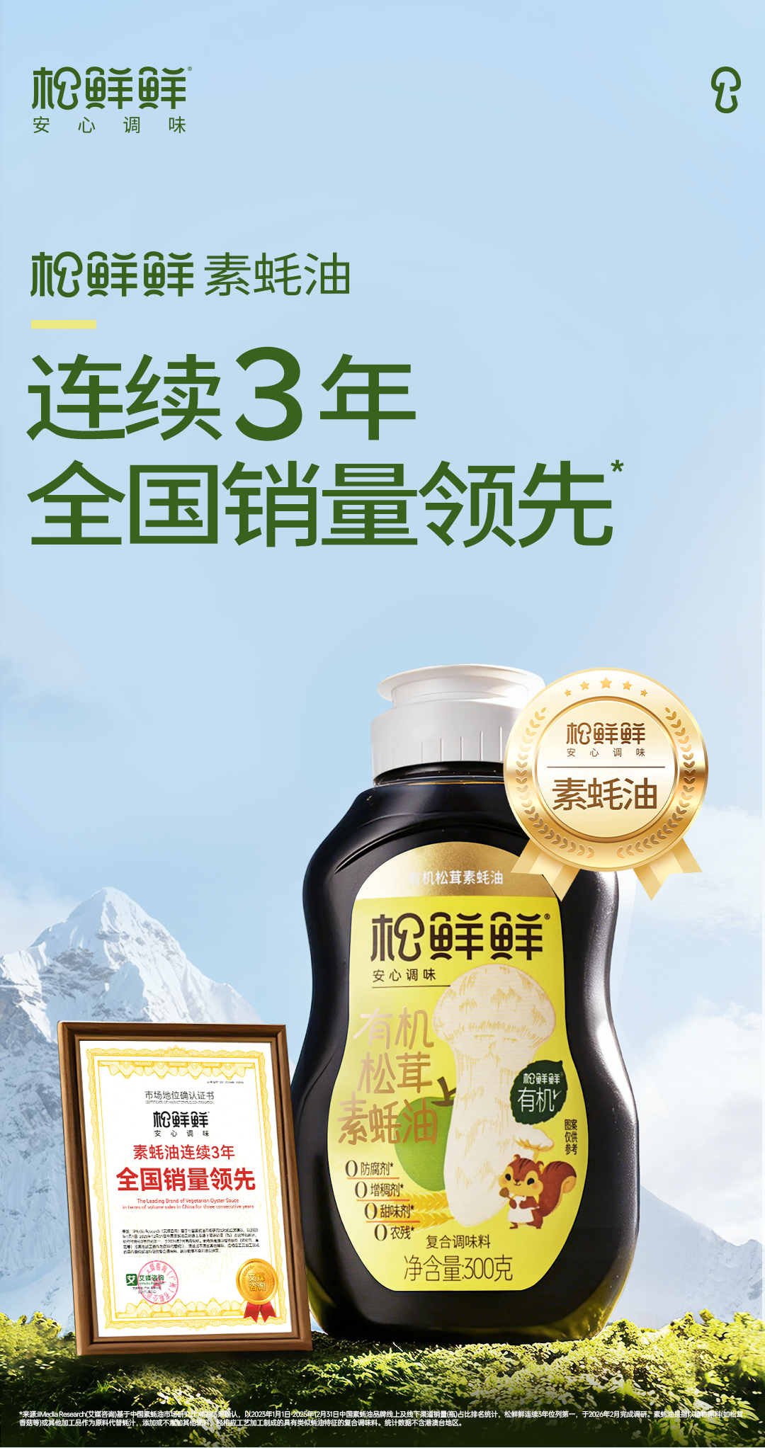 2025年,松鲜鲜整体实现稳健增长,并被第三方数据挖掘和分析机构iiMedia Research授予“松茸调味料连续5年全国销量第一”“松茸调味料连续5年全国销量领先”“松茸酱油品类开创者”三项市场地位确认。