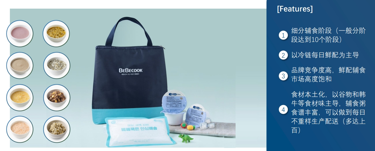 这也是韩国辅食市场的一大特点:以鲜食配送粥为主导。包括BeBecook在内,也是以这样一种鲜食配送粥作为核心产品形态。
